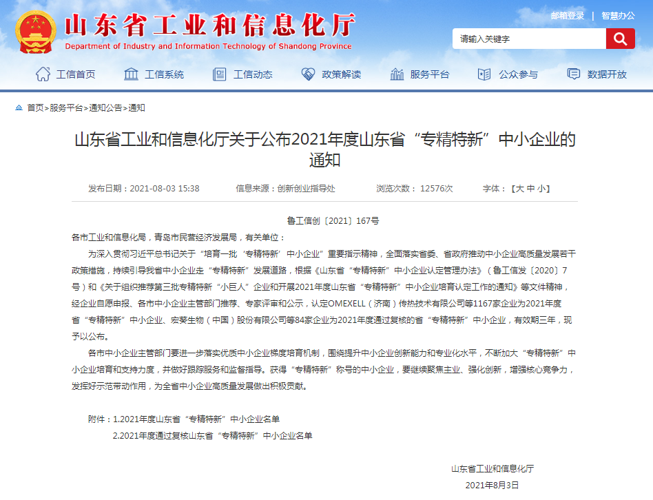 公司获得山东省“专精特新”中小企业